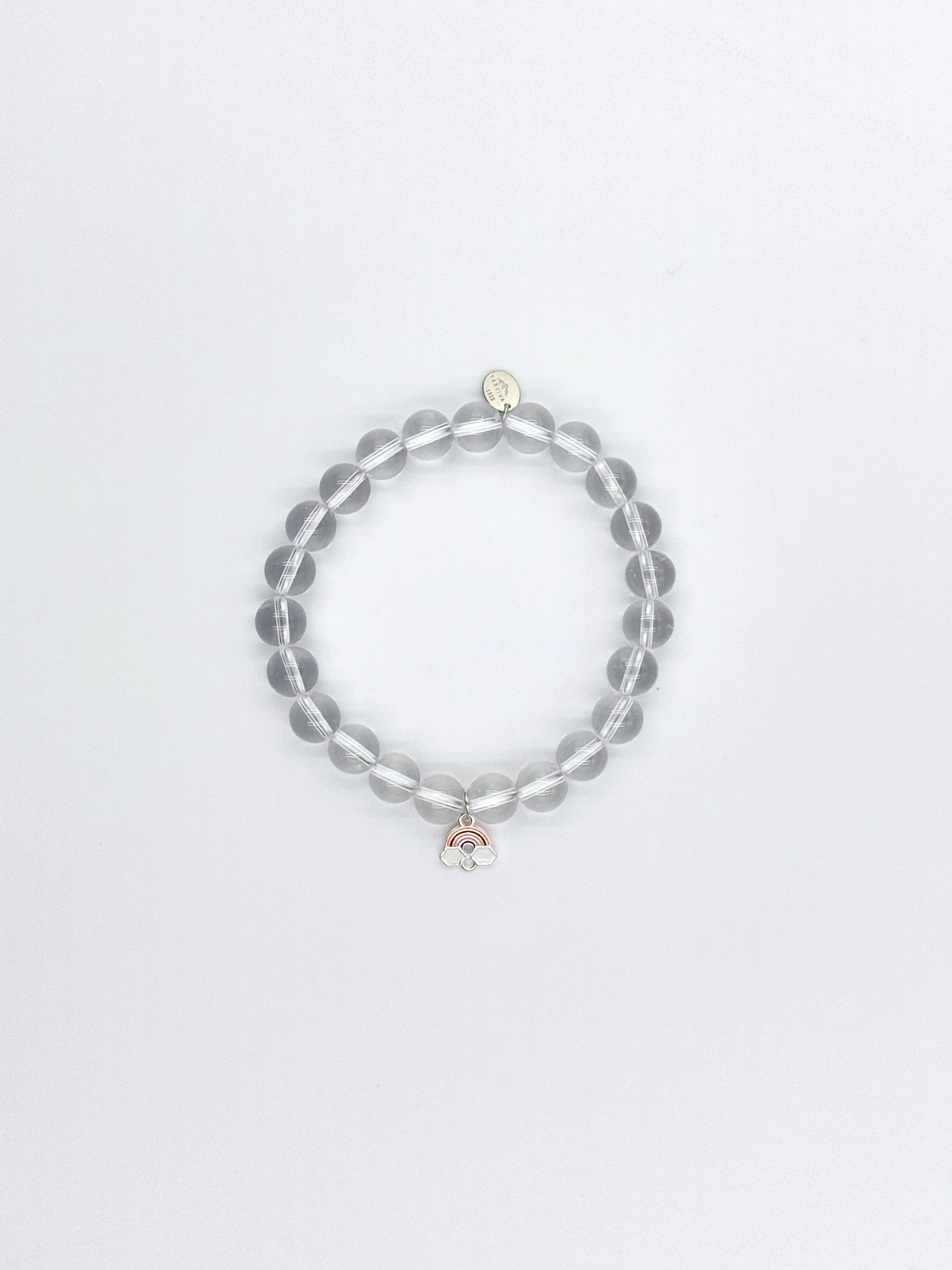 This bracelet is crafted from natural clear quartz, celebrated for its pure transparency and timeless elegance. The sterling silver rainbow charm serves as a vibrant highlight, finished with exquisite enamel craftsmanship. Featuring a double-sided rainbow design, it ensures a harmonious and refined look from every angle. The fusion of crystal clarity and skilled artistry makes this piece both joyful and meaningful for everyday wear.