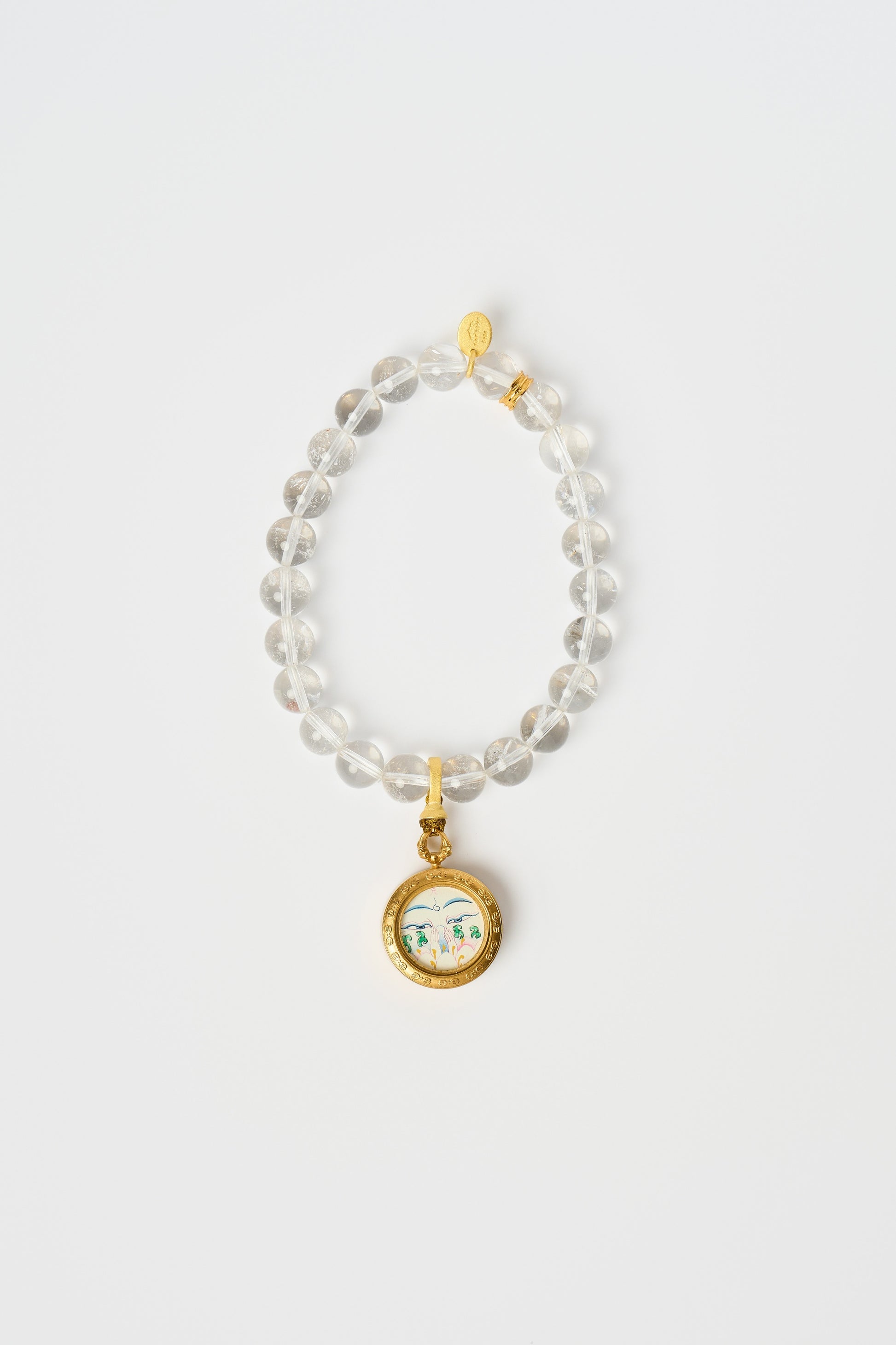Round pendant with a white field, calm half-closed eyes beneath a dark crest, and a joined-hands motif set within blue and pink cloud scrolls. Completed with a gold-tone border and paired with a natural white crystal bracelet. A meaningful accessory for daily styling or gifting.