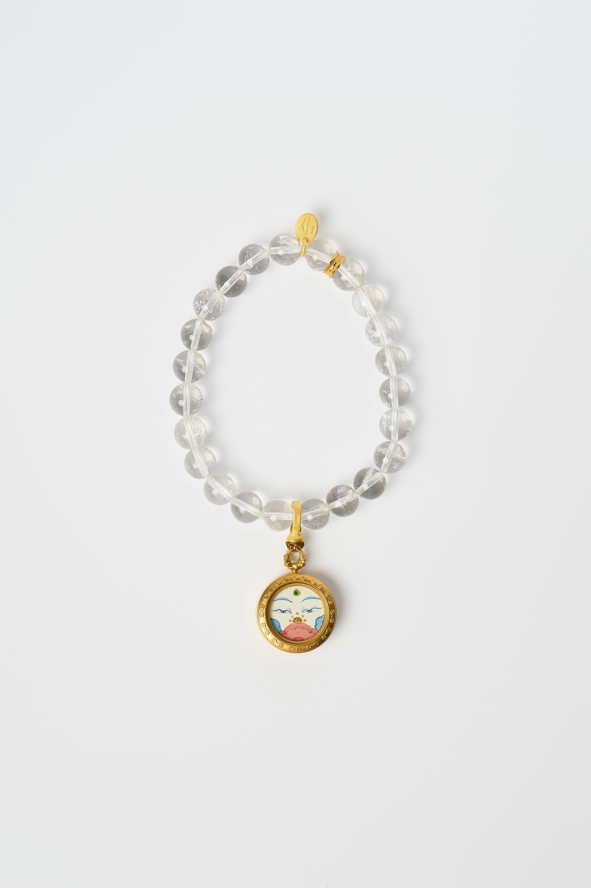 This round pendant features a white background with serene half-closed eyes and a golden circular emblem set among pink and blue cloud motifs. Encircled with a gold-tone frame and paired with a natural clear quartz bracelet, it is a meaningful accessory suitable for daily styling or as a thoughtful gift.