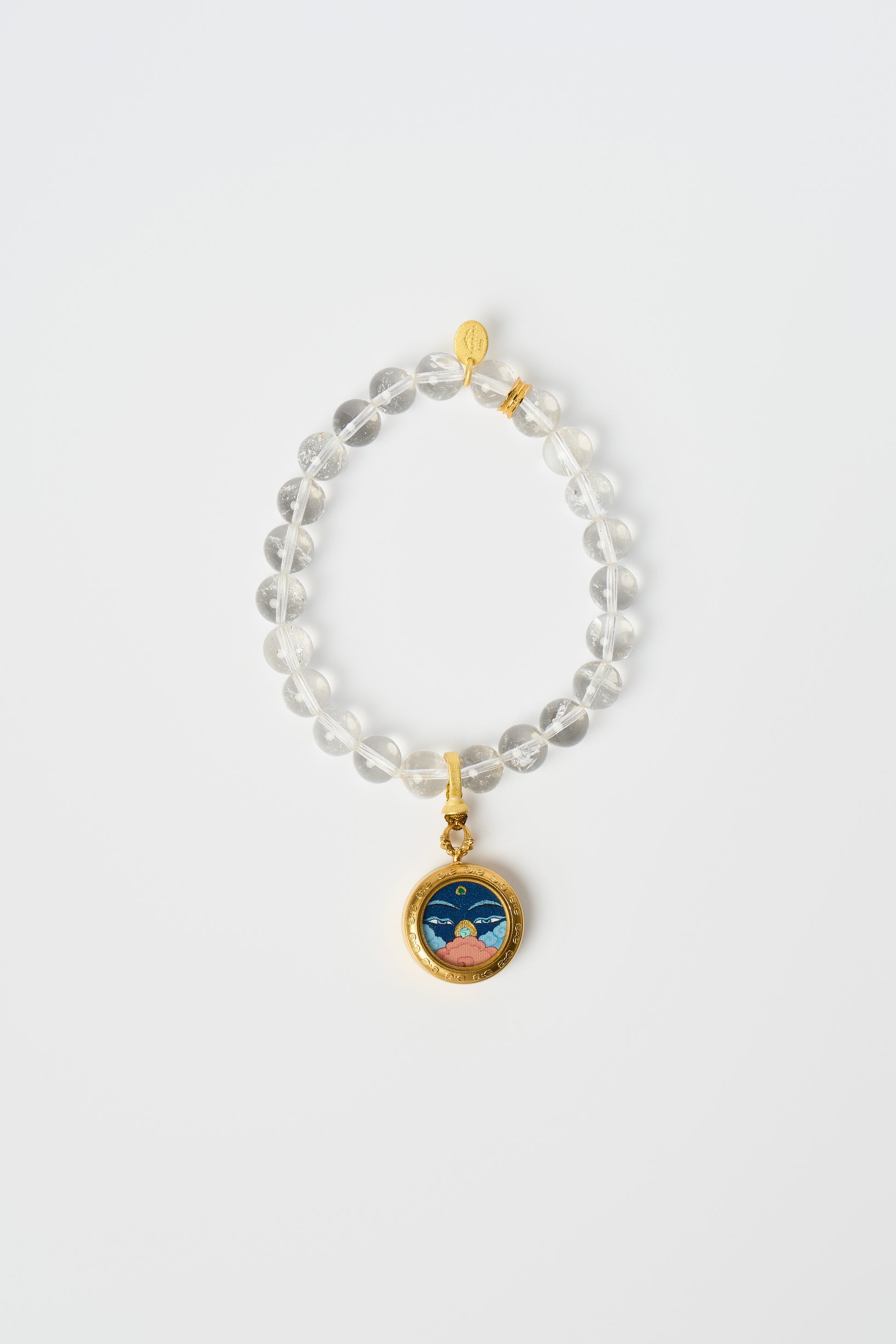This round pendant features a deep-toned design with calm, serene eyes and a radiant gemstone emblem at the center. Flowing scrolls of pink and blue clouds add an artistic touch. Paired with a natural clear quartz bracelet, it is a meaningful accessory for daily styling or as a thoughtful gift.